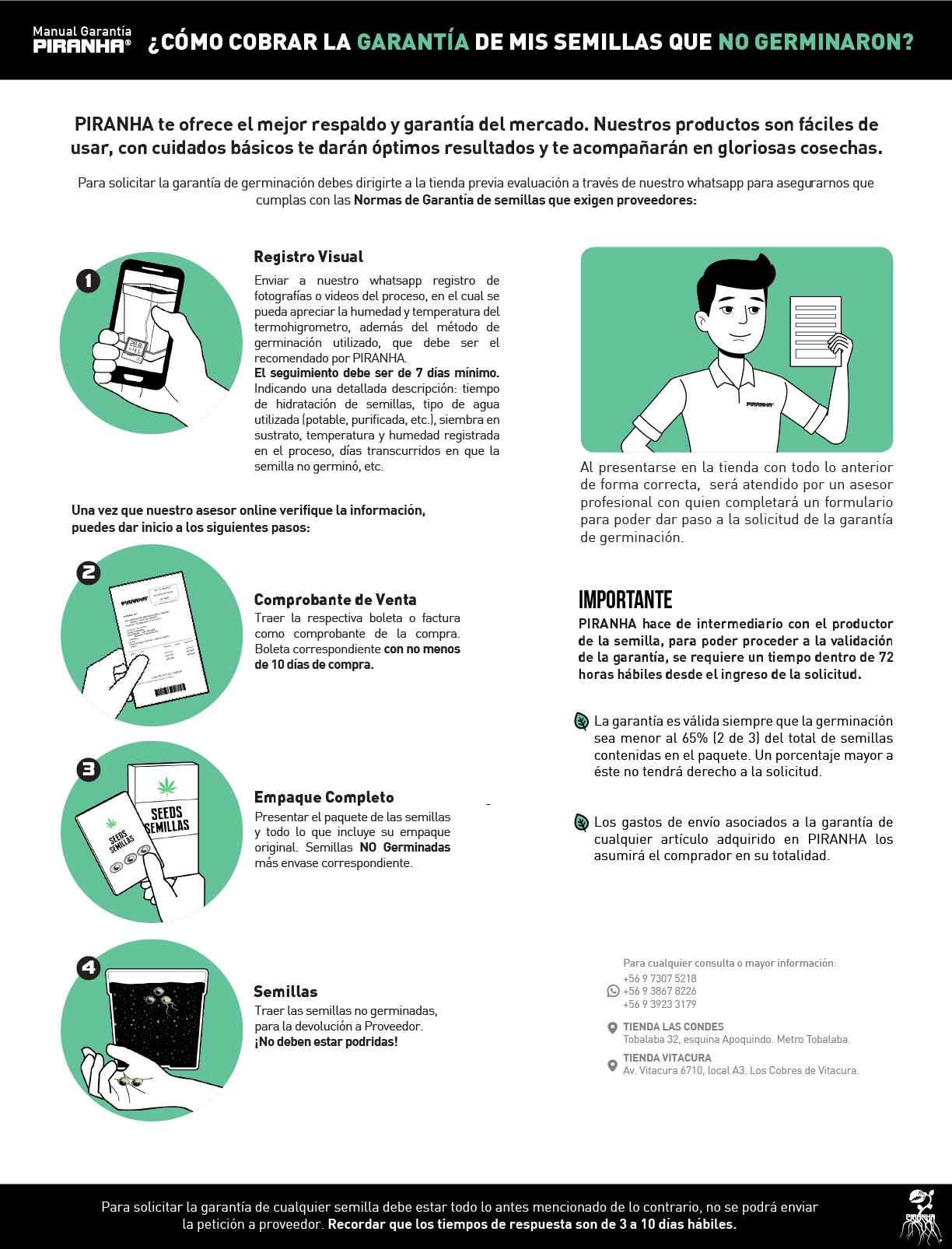 PIRANHA te ofrece el mejor respaldo y garantía del mercado. ¡Queremos que estés contento y satisfecho con tu experiencia de compra! Nuestros productos son fáciles de usar y con cuidados básicos te darán óptimos resultados y te acompañarán en gloriosas cosechas.